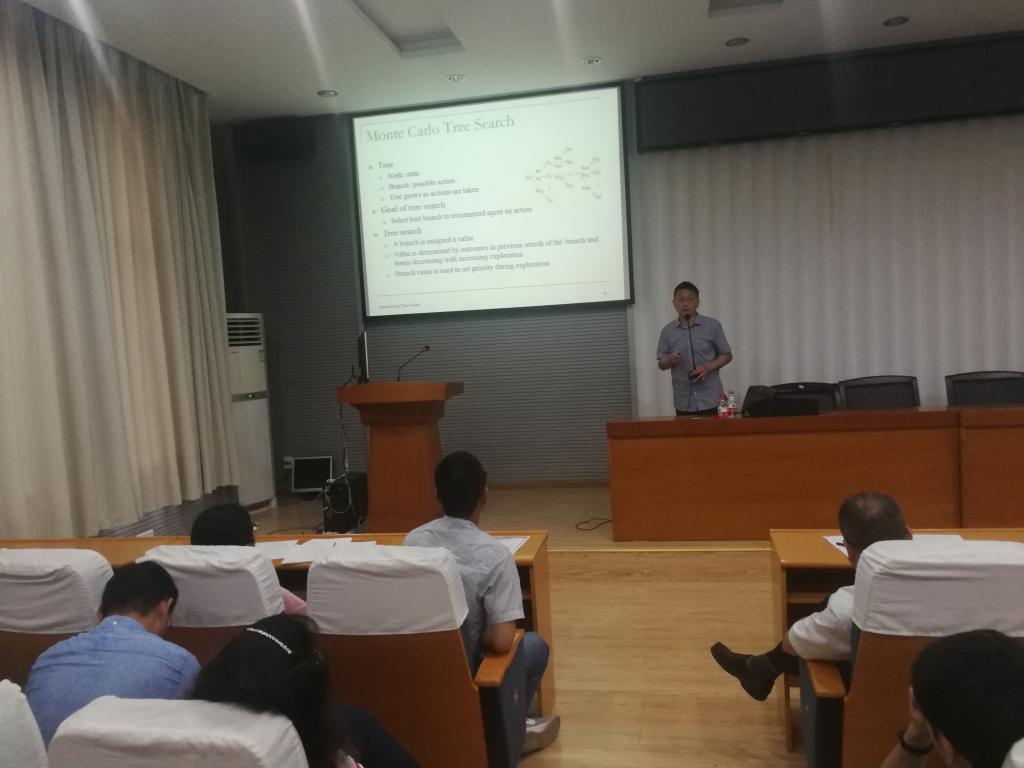 报告分为两部分:第一部分孙博士从新的高度为大家分析了统计学方法,确定性方法,和神经网络方法的异同和适用范围,同学们很好的将已经学习的统计学课程和模式识别课程,以及感兴趣或者正在研究的深度学习建立了关联。孙博士反对直接把算法应用在数据上,建议先进行数据分析,充分了解数据特点后再选择合适的算法。第二部分,孙博士深入浅出的讲解了深度强化学习,从儿童教育,亲密关系等大家熟知的例子入手,给大家讲强化学习的概念,告诉大家强化学习已经成功应用在生活的各个方面然后通过人机围棋比赛的人工智能的成功,来讲AlphaGo强化学习算法