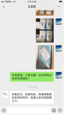校友王亚昆是中国地质大学(武汉)机电学院原“勘探机械”专业(现“机械设计制造及其自动化”专业)072901班学生,现是成都善嘉医药生物医药有限公司的股东,该公司于2011年07月29日成立,经营范围包括医疗器械、生物制品、消毒制品、保健电器的研发及销售等。自发生新型冠状病毒感染的肺炎疫情以来,校友王亚昆十分关注武汉和母校的疫情防控工作,他表示虽然自己已毕业多年,仍然心系武汉和母校、心系老师和同学们,愿竭力在这个特殊时期贡献自己的微薄力量。
