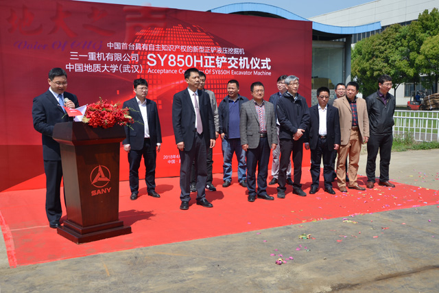 4月18日,由我校和三一重机有限公司(简称“三一重机”)联合研制的中国第一台具有自主知识产权的大型正铲液压挖掘机SY850H,在江苏昆山三一重机7号厂房正式下线交付。该机型的成功研制标志着我国在大型、超大型正铲液压挖掘机机构基础理论与技术方面,已具备独立自主的创新能力,彻底打破了国外正铲液压挖掘机机构专利技术对中国的长期垄断。副校长刘杰,相关单位负责人赴昆山对SY850H挖机进行了验收。