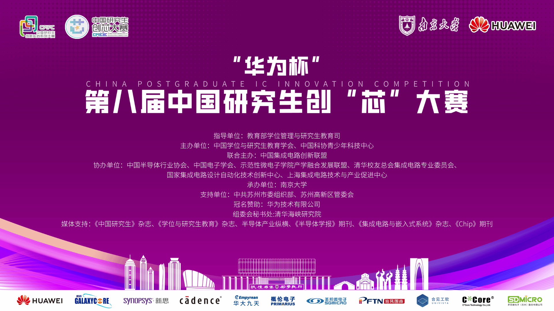 中国研究生创“芯”大赛是由教育部学位管理与研究生教育司指导的中国研究生创新实践系列赛事之一。本届大赛由中国学位与研究生教育学会、中国科协青少年科技中心主办,中国集成电路创新联盟联合主办,中国半导体行业协会、中国电子学会、示范性微电子学院产学融合发展联盟、清华校友总会集成电路专业委员会协办,清华海峡研究院作为秘书处,南京大学承办,中共苏州市委组织部和苏州高新区管委会提供支持,华为技术有限公司冠名。