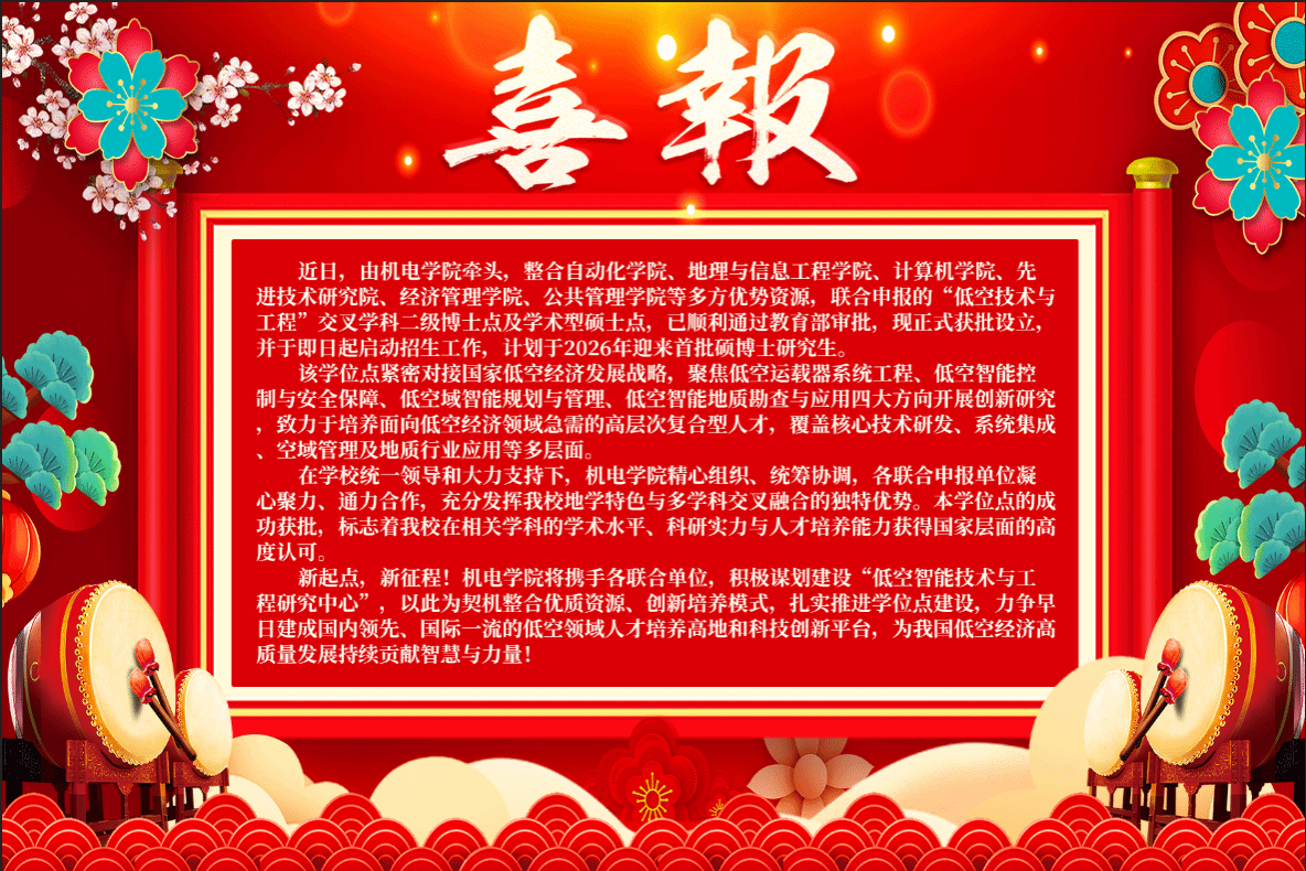 牵头,整合自动化学院、地理与信息工程学院、计算机学院、先进技术研究院、经济管理学院、公共管理学院等多方优势资源,联合申报的“低空技术与工程”交叉学科二级博士点及学术型硕士点,已顺利通过教育部审批,现正式获批设立,并于即日起启动招生工作,计划于2026年迎来首批硕博士研究生。
