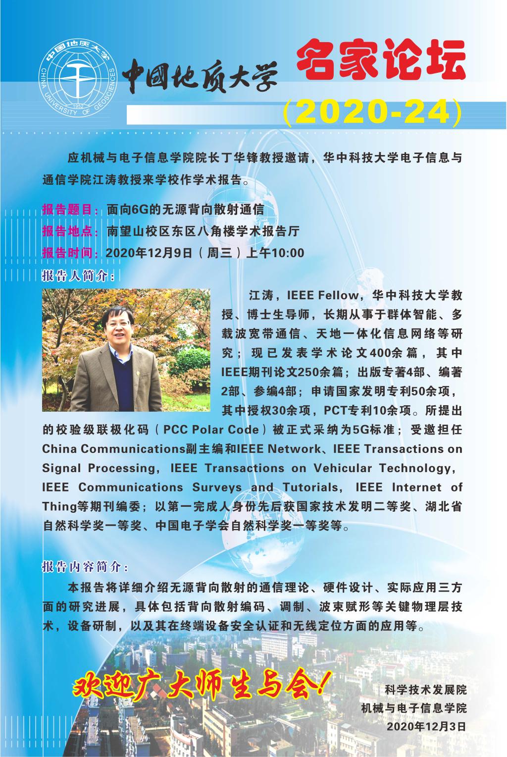 【12月9日】名家论坛:华中科技大学电子信息与通信学院江涛教授学术报告