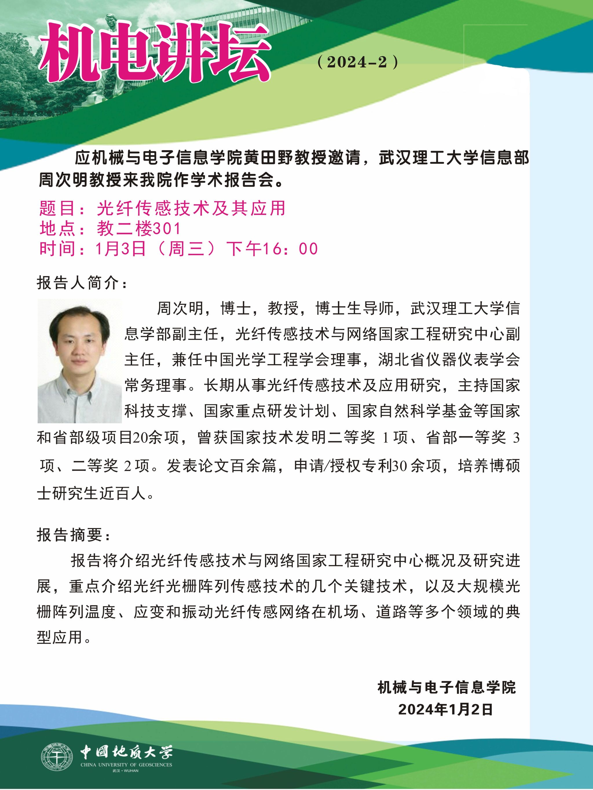 【1月3日】机电讲坛(2024-2):武汉理工大学信息部周次明教授来开云体育官网 作学术报告会