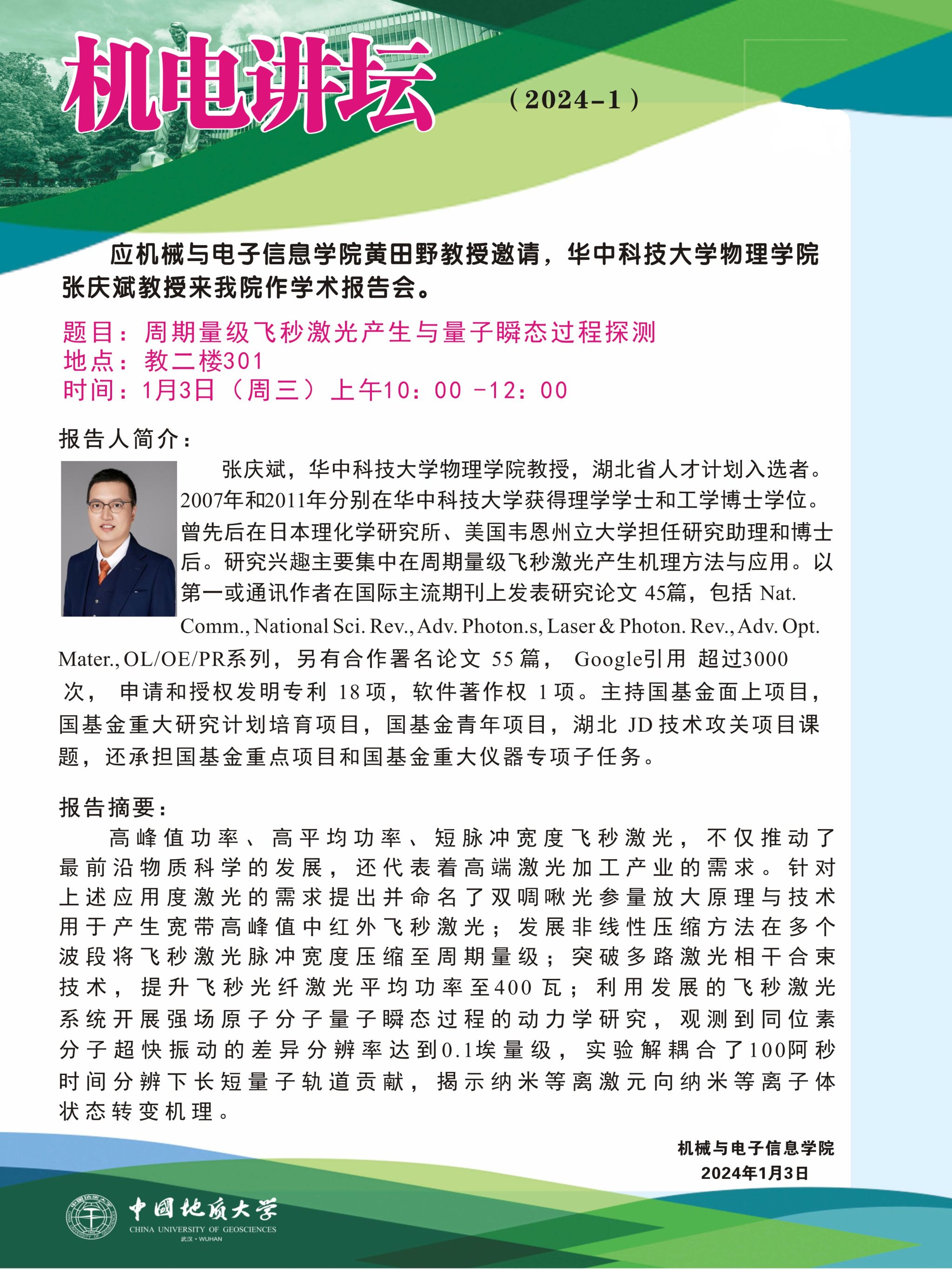 【1月3日】机电讲坛(2024-1):华中科技大学物理学院张庆斌教授来开云体育官网 作学术报告会