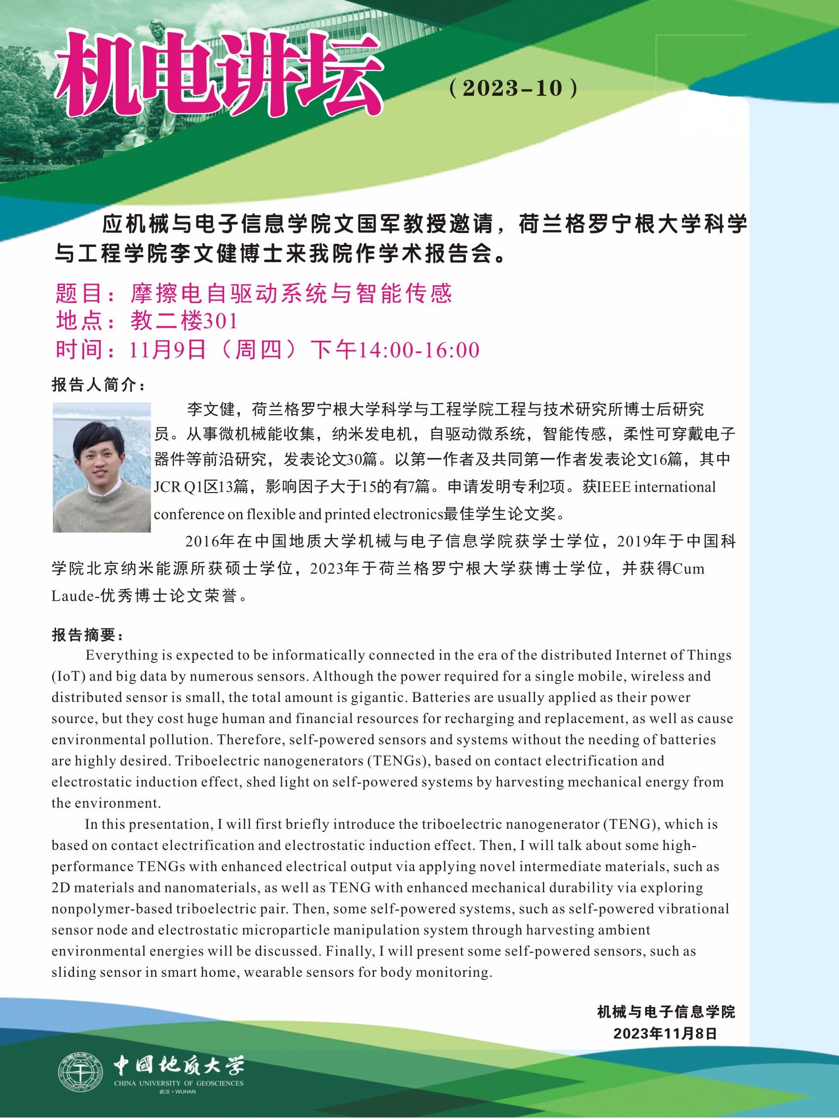 【11月9日】机电讲坛(2023-10):荷兰格罗宁根大学科学与工程学院李文健博士来开云体育官网 作学术报告会