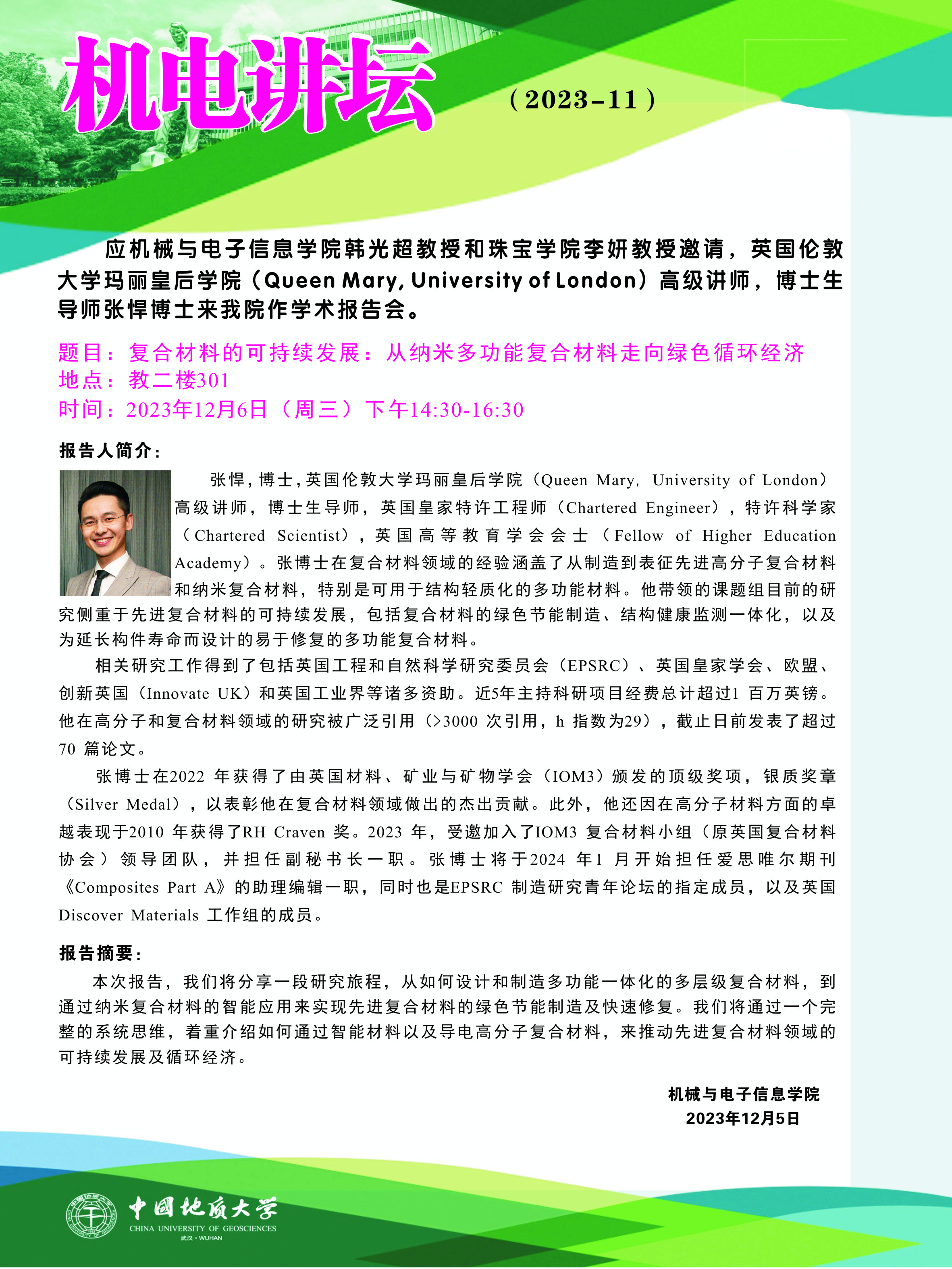 【12月6日】机电讲坛(2023-11):英国伦敦大学玛丽皇后学院张悍博士来开云体育官网 作学术报告会