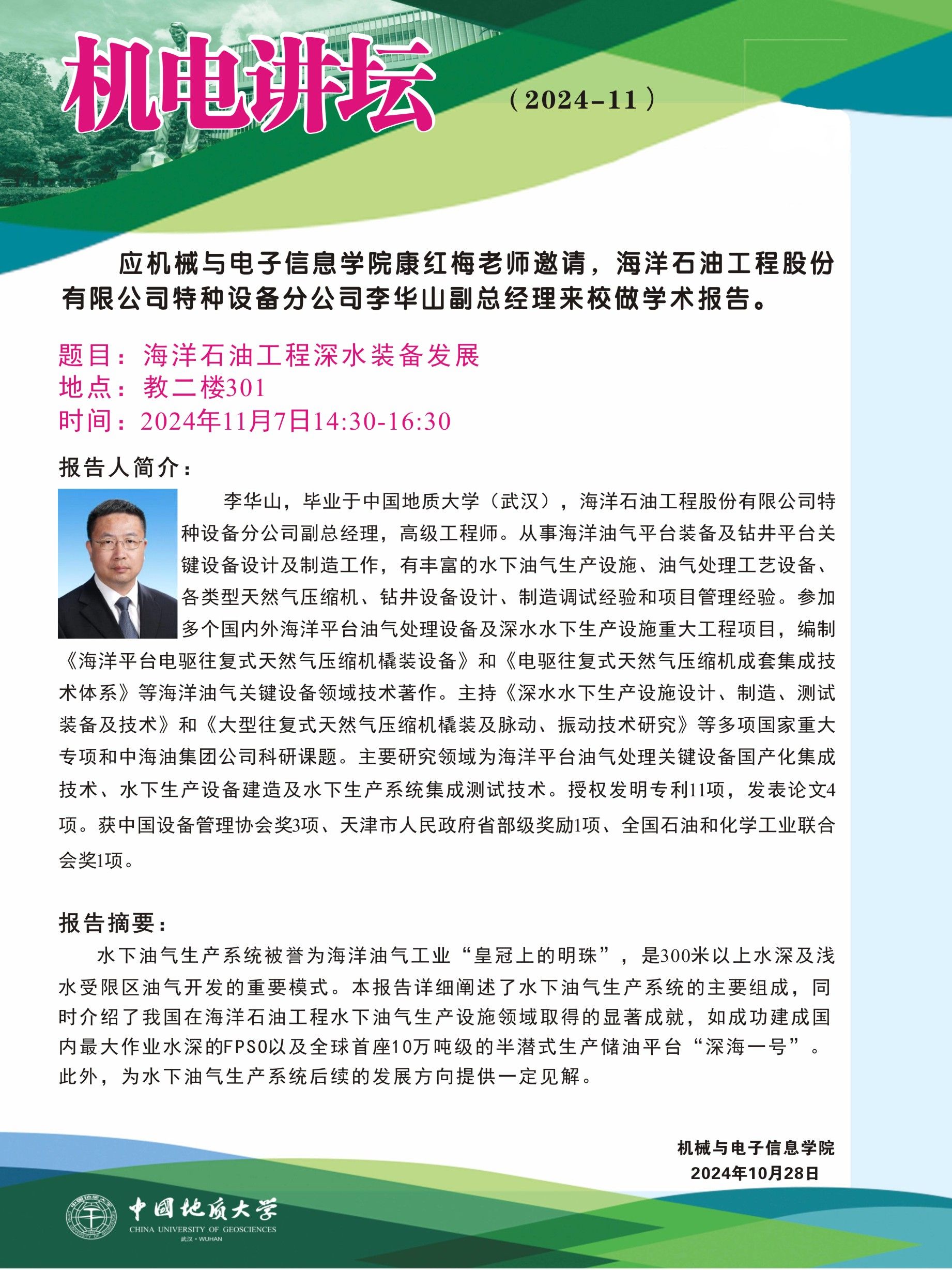 【11月7日】机电讲坛(2024-11):海洋石油工程股份有限公司特种设备分公司李华山副总经理来开云体育官网 作学术报告