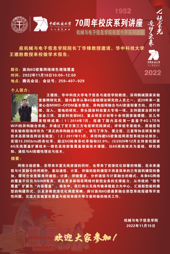 【11月16日】校庆系列学术活动---机电讲坛(2022-28):华中科技大学王德胜教授