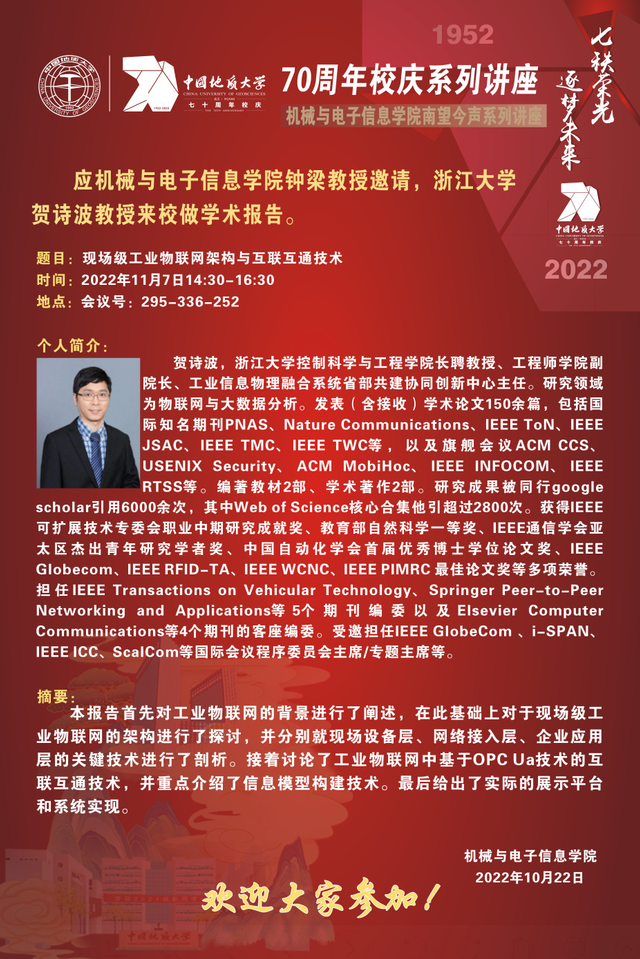 【11月7日】校庆系列学术活动---机电讲坛(2022-22):浙江大学大学贺诗波教授