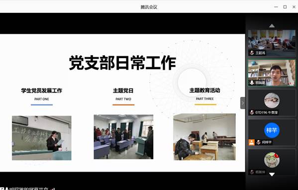 开展线上学生党支部支部书记述职考核大会,党委书记瞿祥华,党委副书记于晓舟和院党委委员罗杰、文国军、黄田野、杨杰在502会议室担任评委,听取支部成立时间已满一年的7名学生党支部书记述职汇报,全体辅导员、学生党支部支委成员、党员代表、入党积极分子代表等50人以在线方式参加会议。