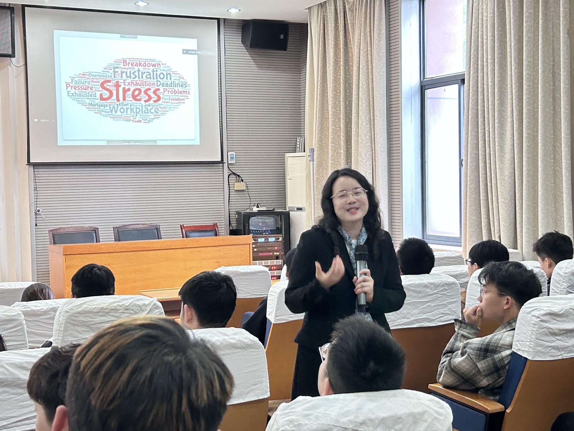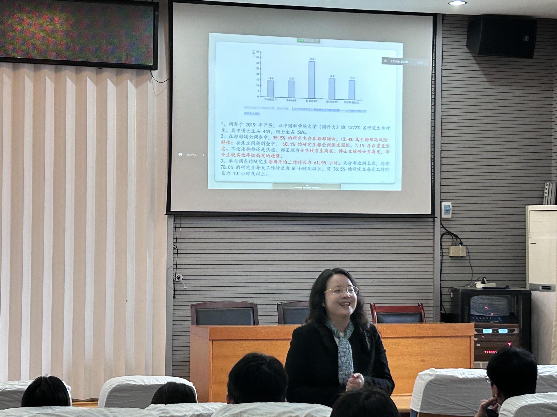 全体研究生授课,辅导员罗采薇主持讲座。