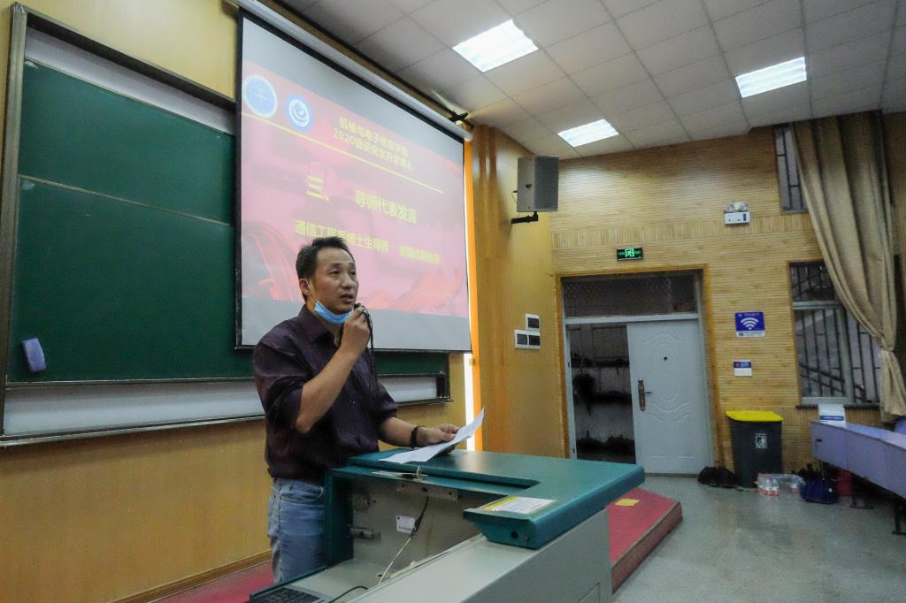导师代表、通信工程系博士生导师郝国成副教授发言。他建议同学们注重人格修养、培养高尚志趣;秉承“艰苦朴素,求真务实”的校训精神;合理规划、严于律己;培养质疑和质询的思维、培养批判和独立思考的能力;做一个坚强、乐观而勤奋的人。
