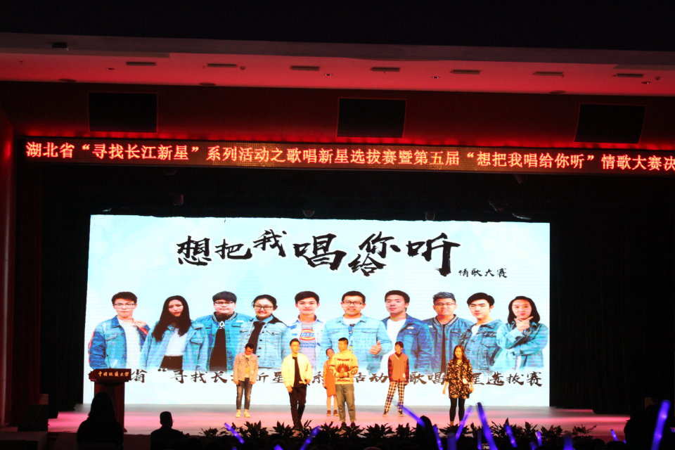 主办的湖北省“寻找长江新星”系列活动之歌唱新星选拔赛暨第五届“想把我唱给你听”情歌大赛决赛在弘毅堂举行。来自武汉大学、华中科技大学、华中农业大学、中南民族大学以及我校的10位选手参加决赛。我校马晓晨凭借一首原创歌曲《随手写的歌》将全场观众带入感人情境,最终斩获冠军;华中农业大学张静获得亚军;华中科技大学谢奇君获得季军。
