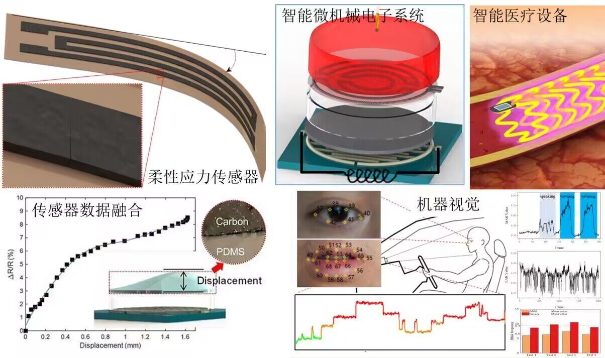 • 硬件方向:压力、湿度、温度等多模态柔性传感器,研究内容涉及器件设计、性能测试、物理试验、应用探索等。